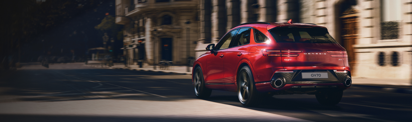 Rear 3/4 view of GV80 driving highwayRear 3/4 view of GV80 driving highway